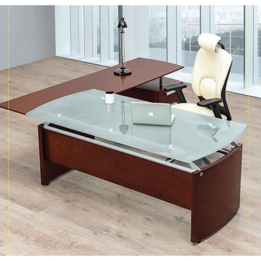 Escritorio ejecutivo con cubierta de cristal esmerilado con lateral y cajonera fija con 1 pap + 1 de archivo (cherry o coffe)